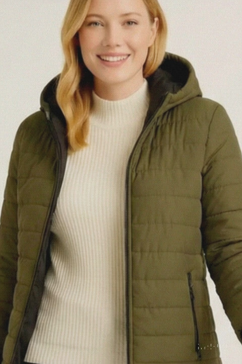 Kadın Şişme Kapüşonlu Fermuarlı Mont Su itici Kapitone Astarlı Kumaş Cepli Kışlık Rahat Kalıp - Haki